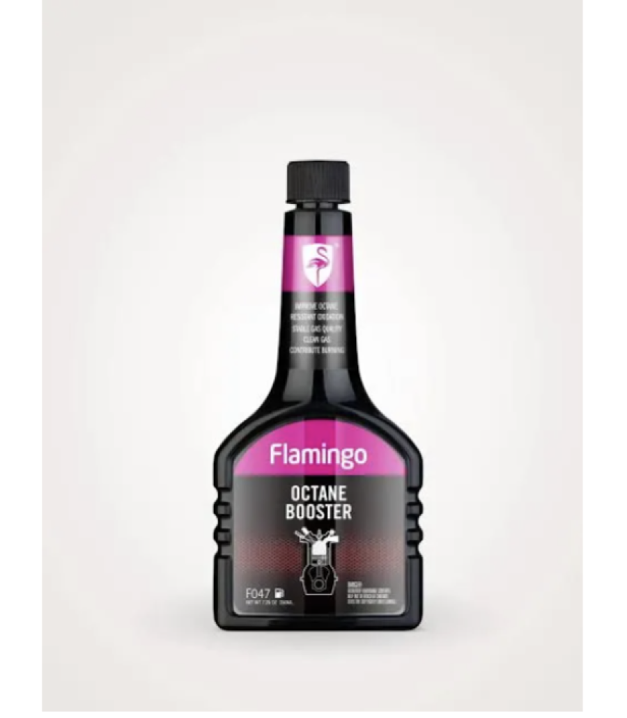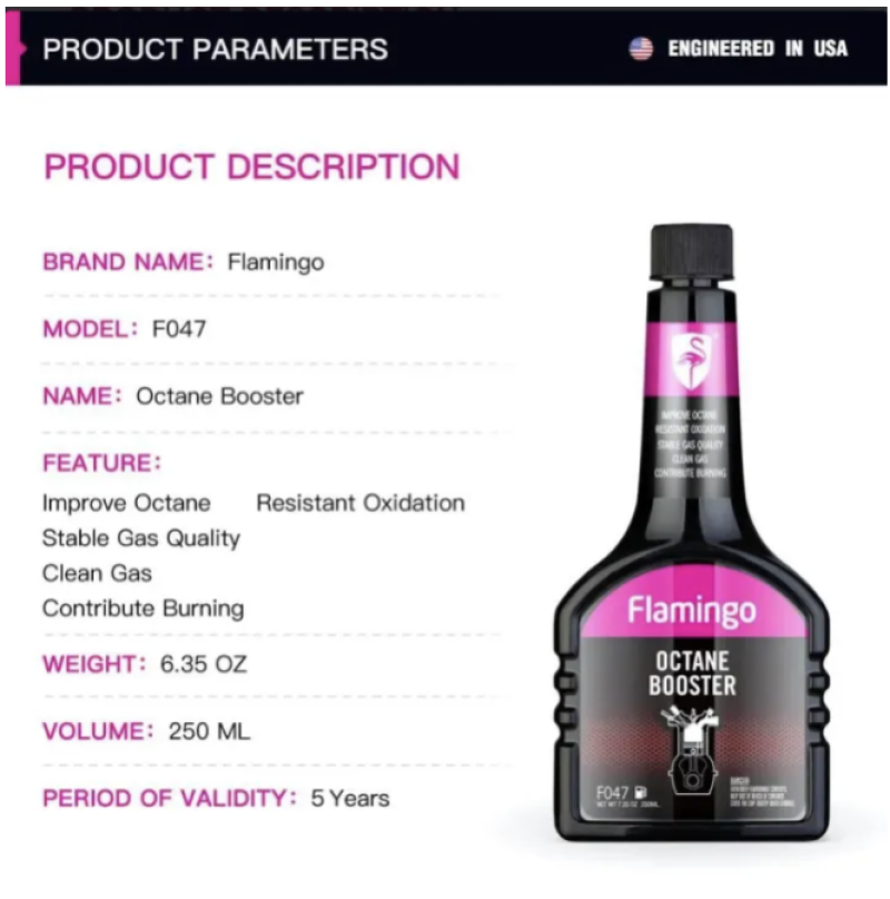 Product Name: Flamingo Octane Booster Item Type: Improves Octane and Gas Mileage Material Type: Liquid Model Name: F047 Item Volume: 250ml Net Weight: 235g Dimensions: Length: 8.6cm Height: 18.7cm Width: 3.8cm Special Features: Stable Gas Quality External Testing Certification: ISO9001 Period of Validity: 5 Years Engineered in the USA & Manufactured in China