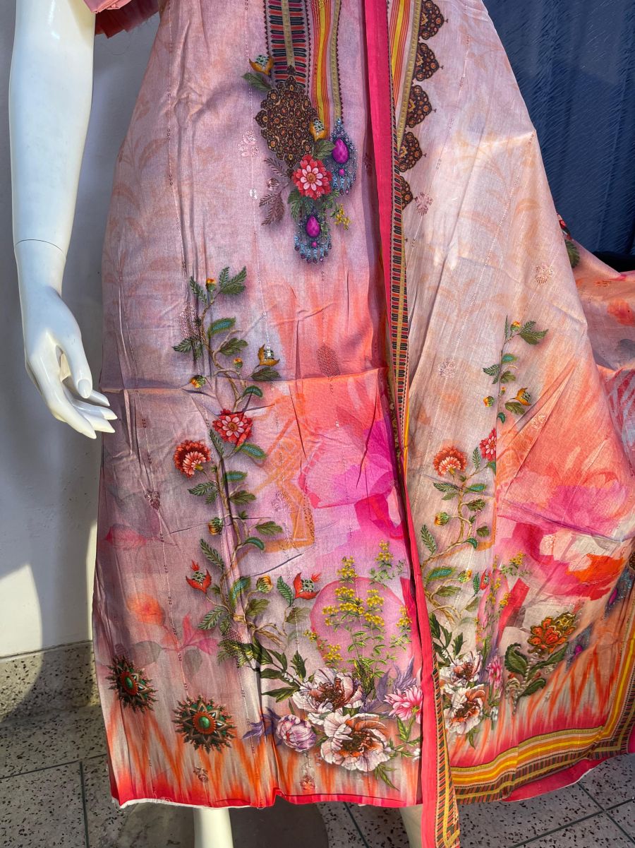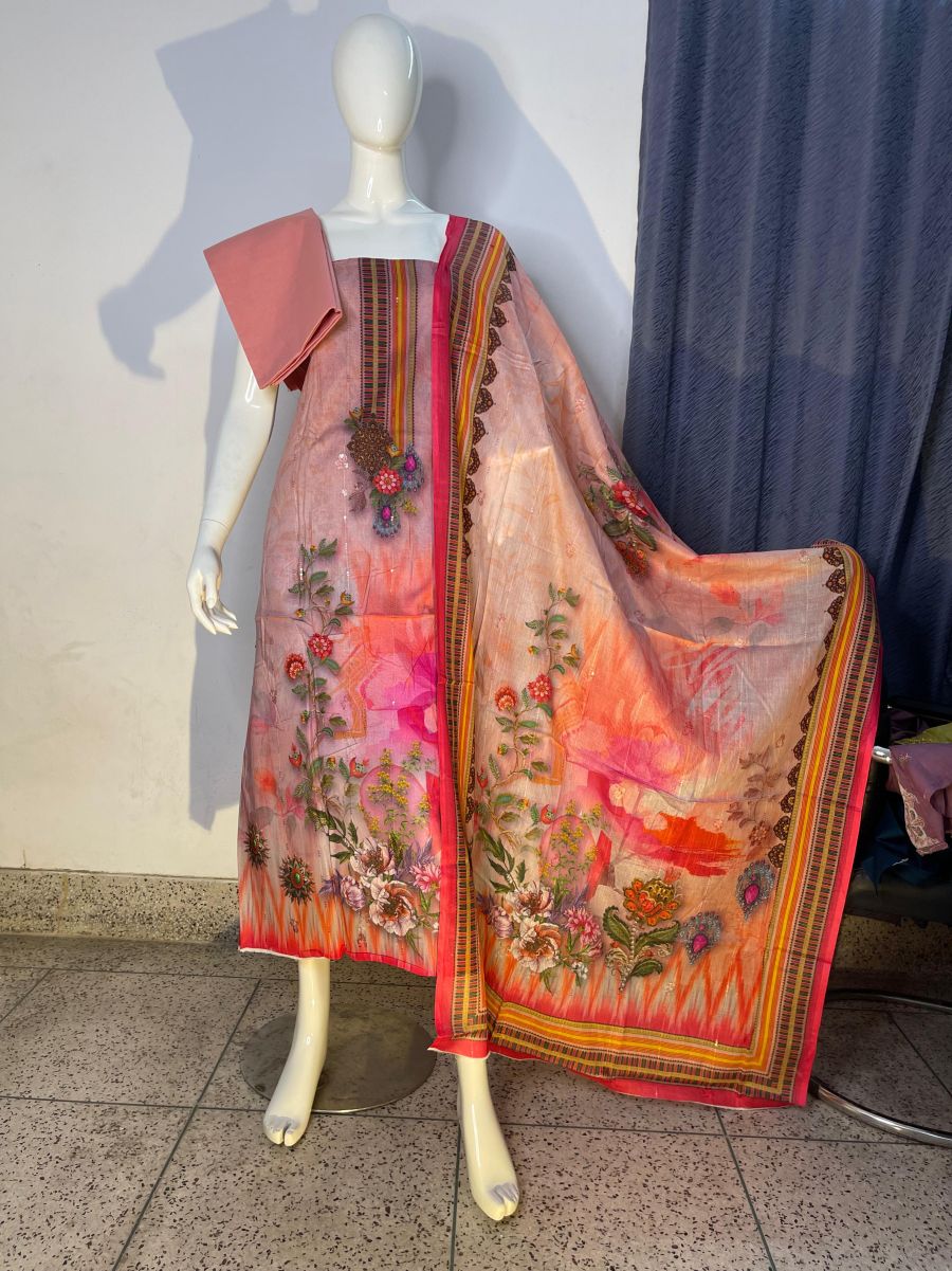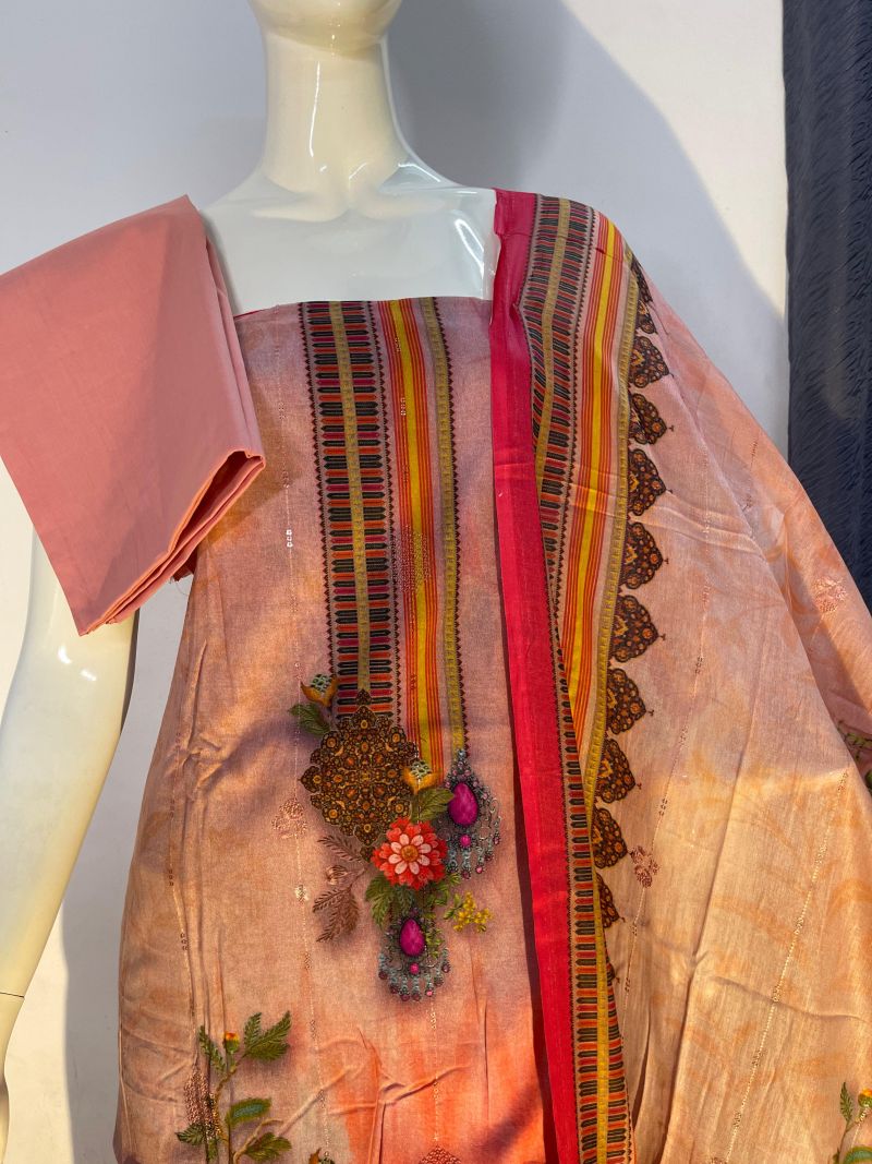 Pure cotton digital print, unstitched, three pieces with embroidery sequence work