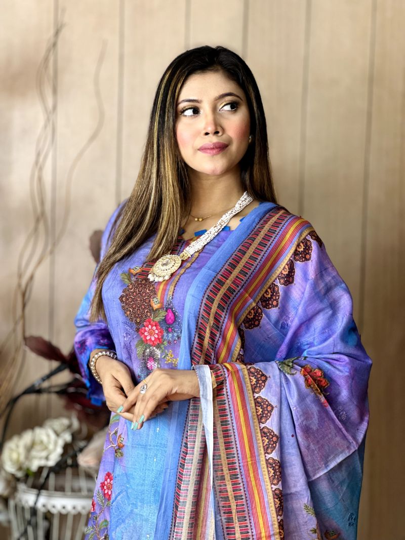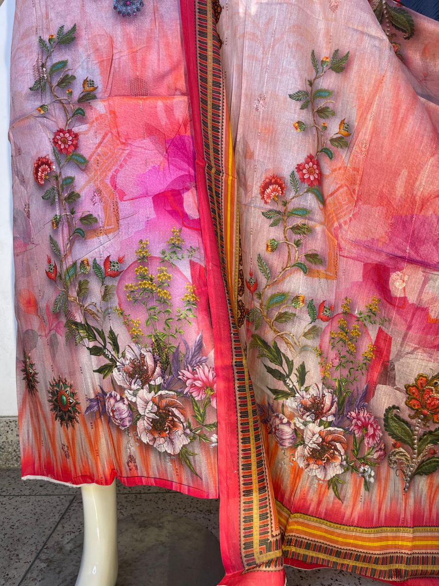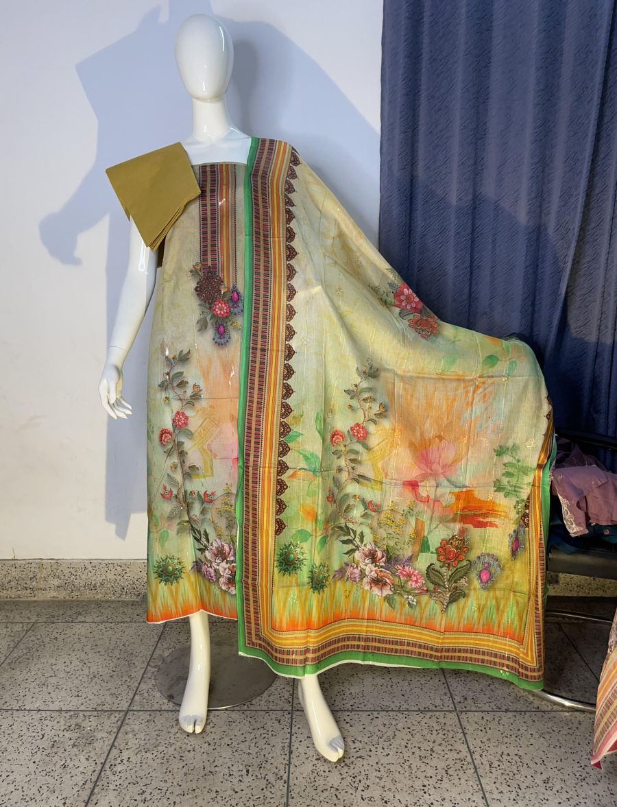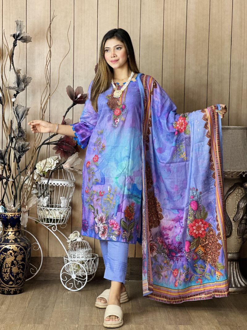 Pure cotton digital print, unstitched, three pieces with embroidery sequence work
